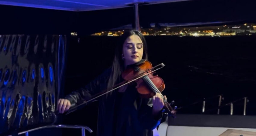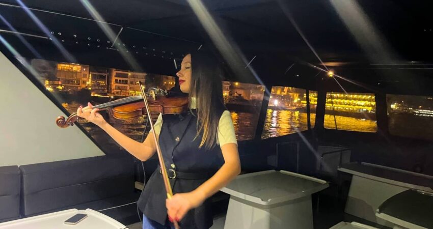 To elevate the romance and ambiance, a live violinist serenades guests with soul-stirring melodies, providing a magical soundtrack to your journey. Sip on premium wines, nibble on fresh grapes, and enjoy a curated selection of gourmet nuts as the gentle waves of the Bosphorus reflect the city lights, creating an atmosphere of serene elegance and luxury.